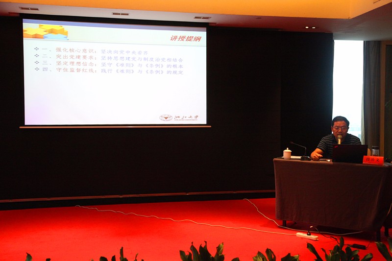 段治文教授從強(qiáng)化核心意識、突出黨建要求、堅定理想信念和守住監(jiān)督紅線四個方面生動細(xì)致地解讀了習(xí)近平總書記系列重要講話精神和治國理政新理念新思想新戰(zhàn)略。他首先提到,必須強(qiáng)化核心意識,即堅決向黨中央看齊?!耙粋€國家,一個政黨,領(lǐng)導(dǎo)核心至關(guān)重要”,為了推進(jìn)全面從嚴(yán)治黨,需要一個核心領(lǐng)導(dǎo)者,而這個領(lǐng)導(dǎo)者就是習(xí)近平總書記。要理解習(xí)近平總書記治國理政新理念新思想新戰(zhàn)略,首先要從理解“中國夢”開始。所謂“中國夢”就是指實現(xiàn)中華民族的偉大復(fù)興。段治文說,一定要堅持思想建黨與制度治黨相結(jié)合?!凹t船精神”是中國共產(chǎn)黨建黨過程中首創(chuàng)、奮斗、奉獻(xiàn)精神的象征,更是黨與人民關(guān)系的有力體現(xiàn),學(xué)習(xí)和弘揚(yáng)“紅船精神”就是思想建黨;完善規(guī)范、健全制度、扎緊制度籠子,則是解決矛盾與問題的要點(diǎn),學(xué)習(xí)和牢守黨章黨規(guī)就是制度治黨。段教授強(qiáng)調(diào),共產(chǎn)黨員要堅守《準(zhǔn)則》與《條例》的規(guī)定,絕不做腳踩紅線、失掉底線的事。